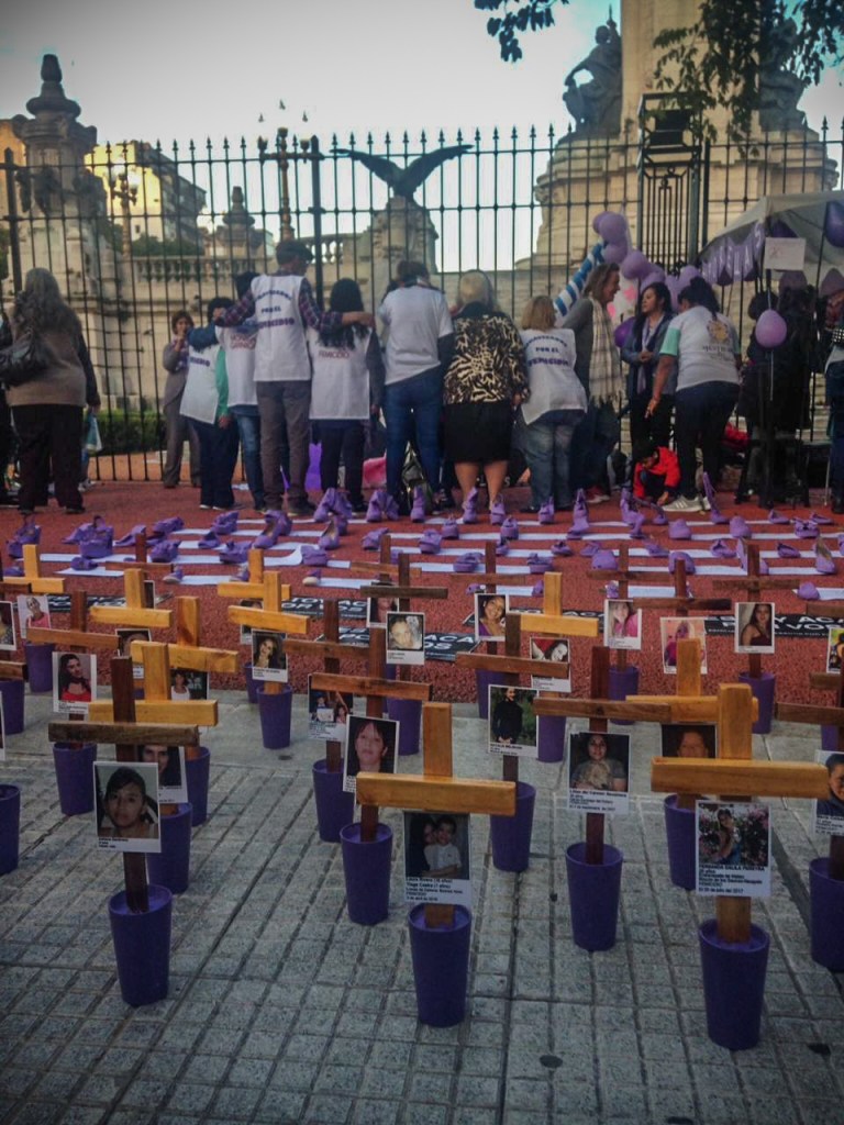La movilización inició en el congreso avanzando a Plaza de Mayo. La emblemática plaza que ha refugiado grandes consignas y luchas populares argentinas. Hace algunos años recibe también pedidos de políticas que impidan que las mujeres, niñas y adolescentes sigan muriendo de forma violenta. A las 17 horas, el congreso tenía sus calles laterales repletas de filas organizadas y listas para marchar. Carteles con frases como: “nos mueve el deseo”, “vivas nos queremos” y “en mi cuerpo decido yo” aparecían entre la multitud. Una intervención tenía zapatos de distintos estilos pintados de color lila, vasos del mismo color con una cruz amarilla y una foto de una mujer con su nombre y la forma en la que había muerto, delante de todo, un cartel negro con letras grandes blancas que decía: “estoy acá por vos”.